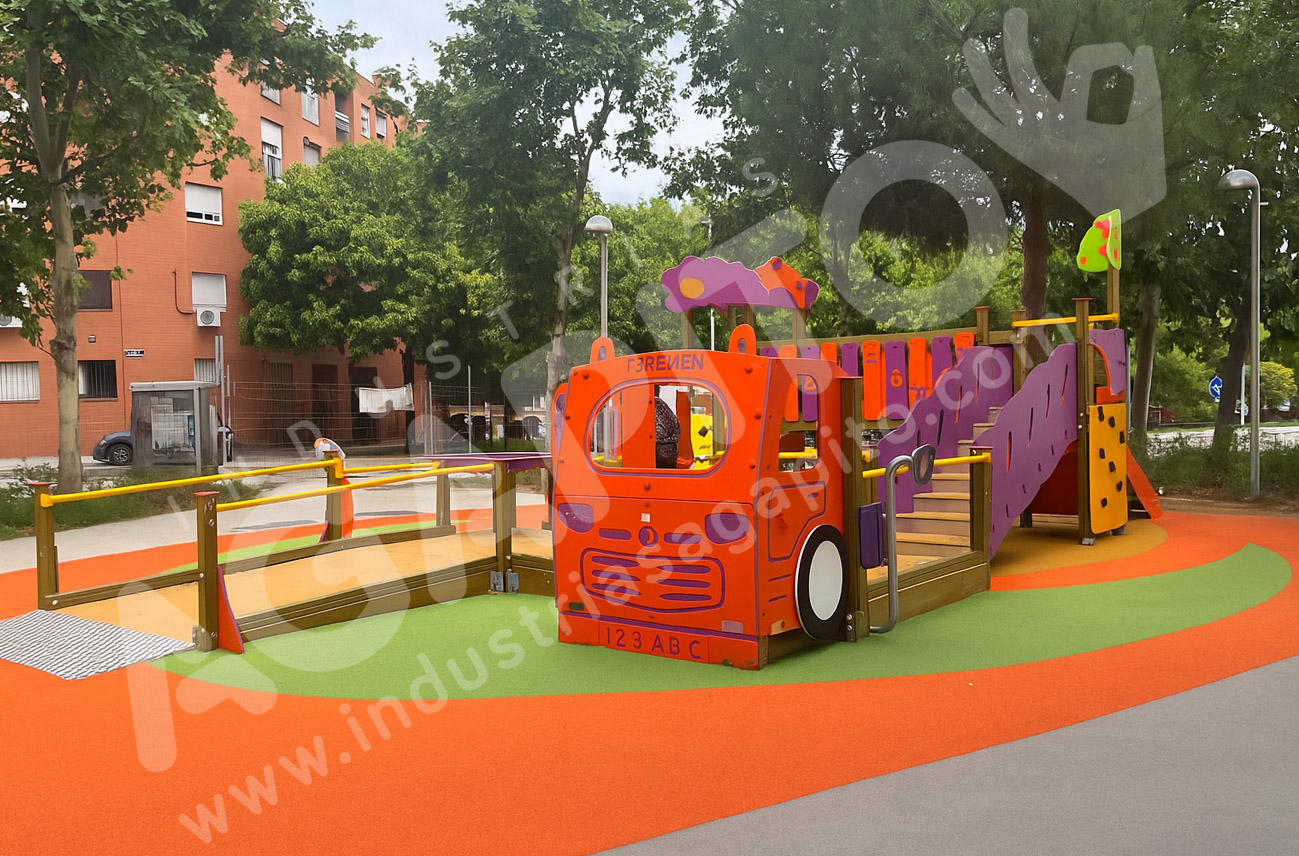 L’élément principal de ce parc inclusif est la Caserne de Pompiers, une structure multi-jeux accessible aux fauteuils roulants, comprenant des rampes d’accès, des panneaux ludiques, des jeux d’habileté, des éléments sensoriels et des décors thématiques. Son design ouvert et accessible permet à tous les enfants de jouer ensemble, encourageant le développement physique et émotionnel dans une approche inclusive.
