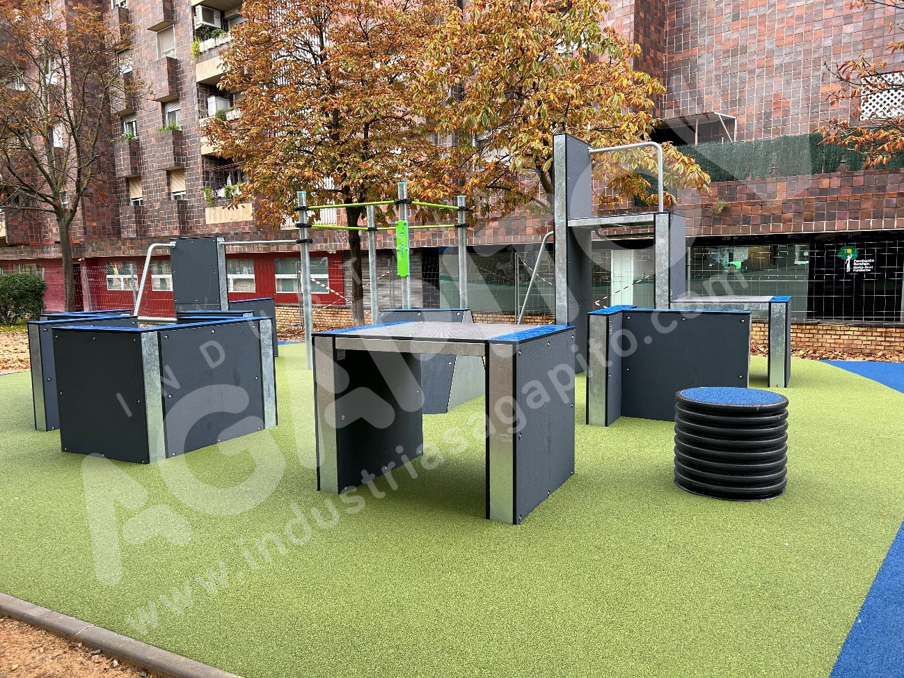 Le Parkour est un sport non compétitif qui permet de travailler la force et l’habileté des mouvements du corps à l’aide de différents équipements. À Tudela, plusieurs plateformes de saut, murs de précision, murs de fluidité et murs de bras ont été installés. L’objectif est de faire bouger l’ensemble du corps en réalisant des exercices sur les différents appareils. Les éléments Parkour d’Industrias Agapito ont été certifiés selon l’exigeante réglementation européenne EN16899.