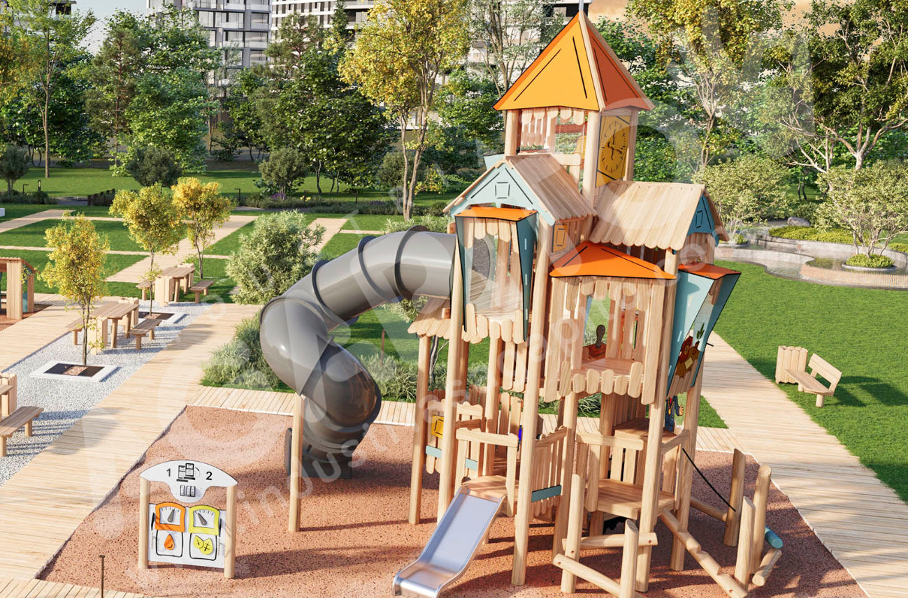 Además, ROBINIA incorpora soluciones para el juego sensorial como areneros y acueductos, que permiten la interacción con agua y arena, fomentando la experimentación y el aprendizaje a través del juego libre. La colección se completa con circuitos y recorridos, elementos de equilibrio, barras gimnásticas, columpios, muelles y balancines, configurando una oferta global en madera que responde a múltiples necesidades.